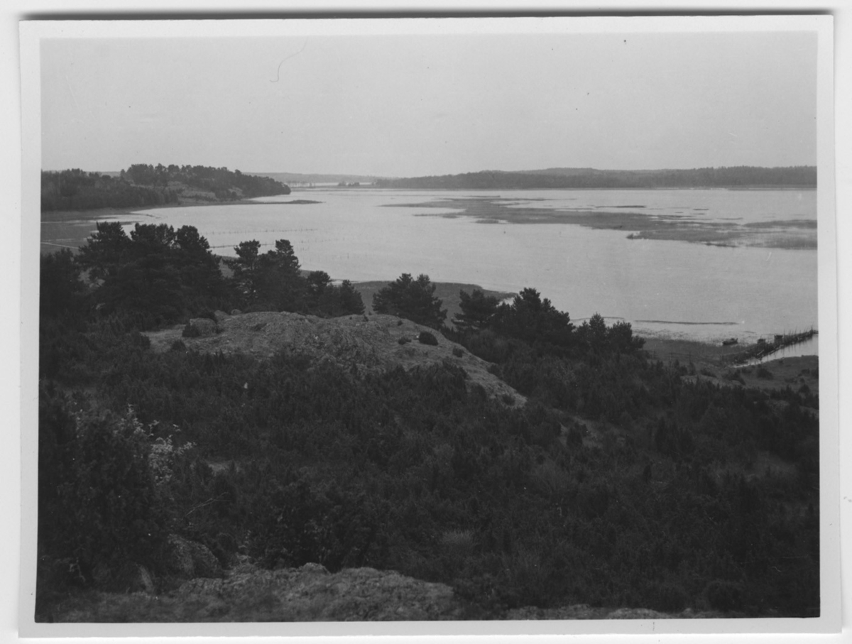 'Utsikt över sjön från norr, vy med vass i sjön. Vyn tagen uppifrån berghäll bevucen med tall och en. :: Text på baksidan:''Utsikt över sjön från norr. Vattnet har stigit ytterligare (jämför föregående bild). Hela bältet mellan stranden och vassbältet var föregående år vid samma tid torrlagt. Ett mellanting torde vara det normala.'' :: Ingår i serie med fotonr. 2305-2346.'