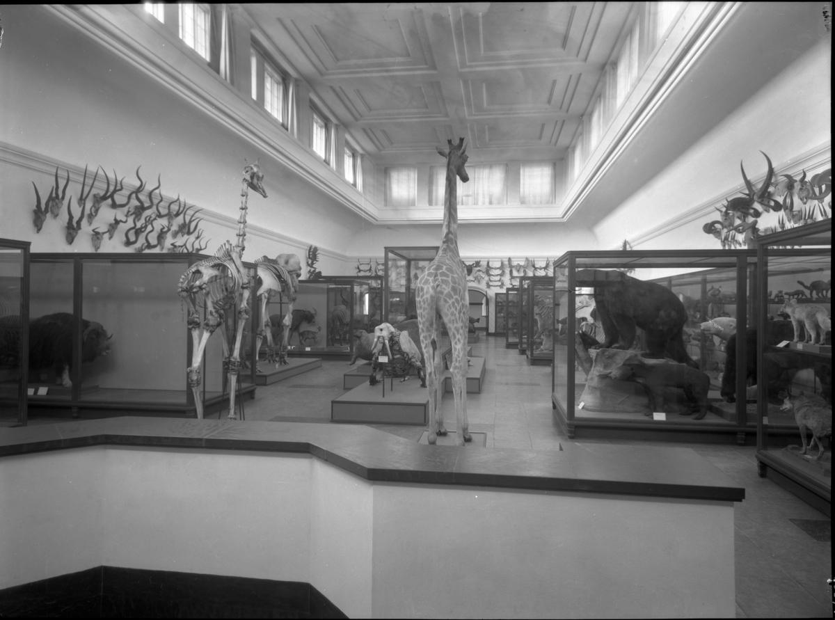 'Däggdjurssalen sedd från syd mot nord, från trappan mot vestibulen. Monterade djur, skelett stående fritt samt i skåpmontrar. Horn uppsatta på väggarna. :: :: Montering av bl.a. :: - Giraff: Hona, Ma.ex. 996, fynddatum: 1930-02-26. Fyndlokal: Kenya. Monterad av David Sjölander. Utställd i däggdjurssalen på Göteborgs Naturhistoriska Museum (2007-11-01) :: :: - björn (på stort stenblock): Ma.ex. 611, fynddatum: 1906-01-00. Ursprung: Född i Ryssland, Petersburgs Zool. Trädgård, död i fångenskap i Göteborg Lorensberg. Utställd i monterskåp nr. 24 i däggdjurssalen på Göteborgs Naturhistoriska Museum (2007-11-01). :: :: - Indisk elefant, skelett av: Coll.an. 3199. Fynddatum: 1913-00-00. Fyndlokal: Vietnamn. Står utställd i vestibulen utanför däggdjurssalen på Göteborgs Naturhistoriska Museum (2007-11-01). :: :: - Myskoxe: Ma.ex. 537. Fynddatum: 1899-00-00. Fyndlokal: Grönland. Monterad av konservator Hilmer Skoog. Finns utställd i monterskåp nr. 44 i däggdjurssalen på Göteborgs Naturhistoriska Museum (2007-11-01). :: :: Skelett av valross och giraff (främre till vänster), säl och zebra synliga. I förgrunden är trappan ner synlig. :: :: Ingår i serie med fotonr. 2735-2769.'