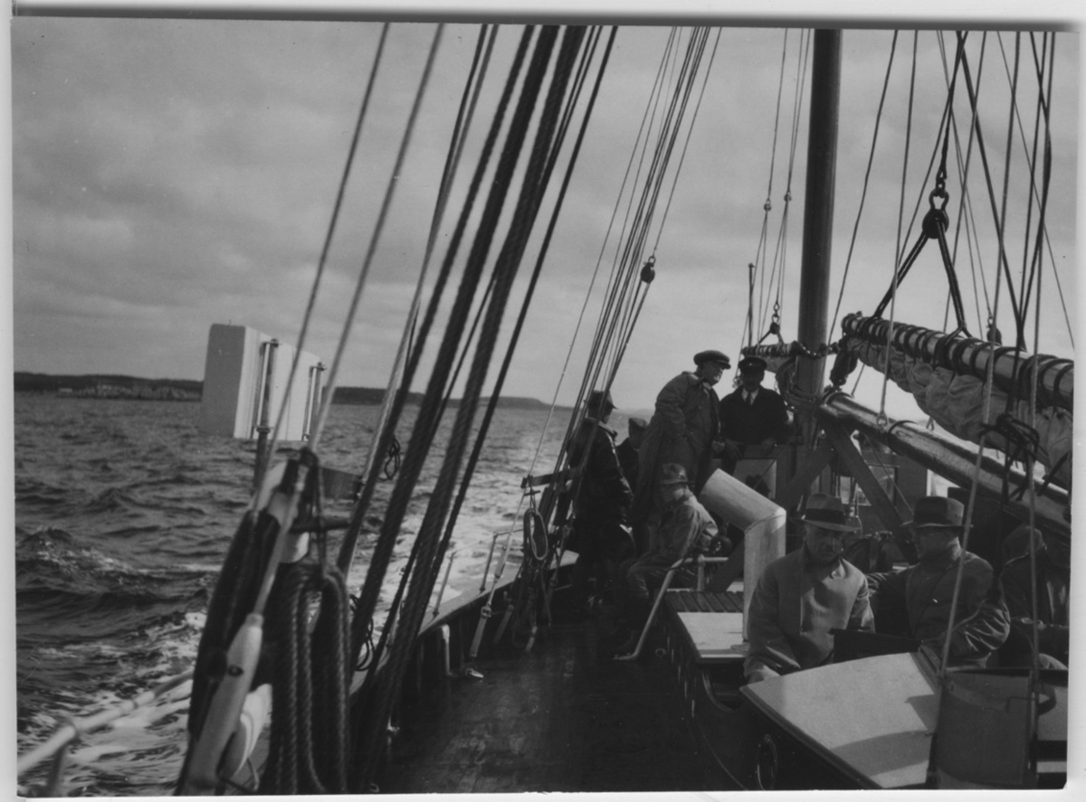 'Göteborgs Biologiska förenings utfärd till Fjärås-Onsala-Nidingen-Malön-Kalvön: :: :: Knappt 10 st män synliga, ombord på båten ''Wilh. R. Lundgren''. :: :: Se fotonr. 2489-2500 och 2501-2515 från samma utfärd.'
