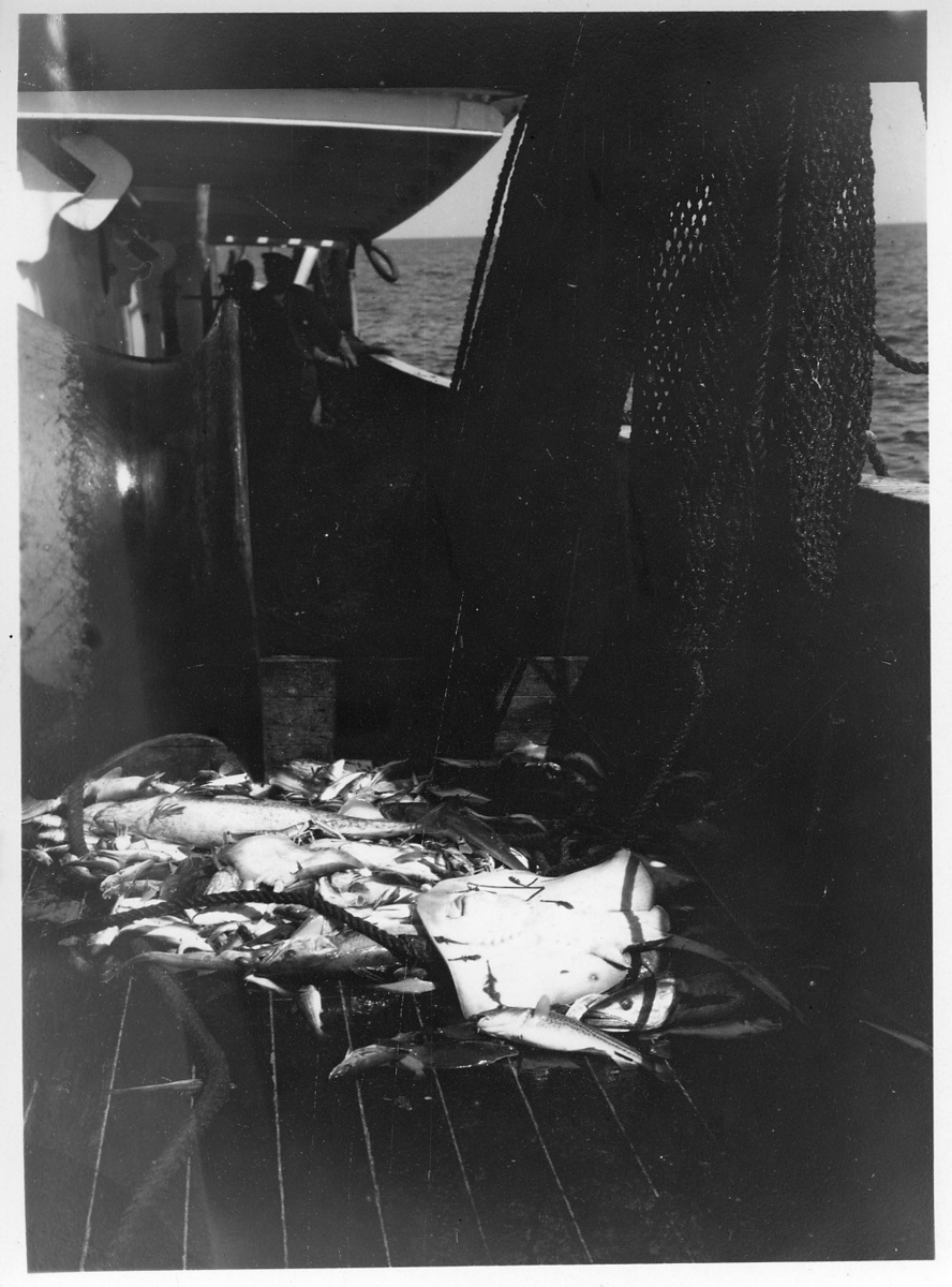 'Akka-expeditionen sommaren 1931: :: :: Fiskfångst på Skandias däck, människa skymtar på båtdäck. :: :: Ingår i serie med fotonr. 2182-2234.'