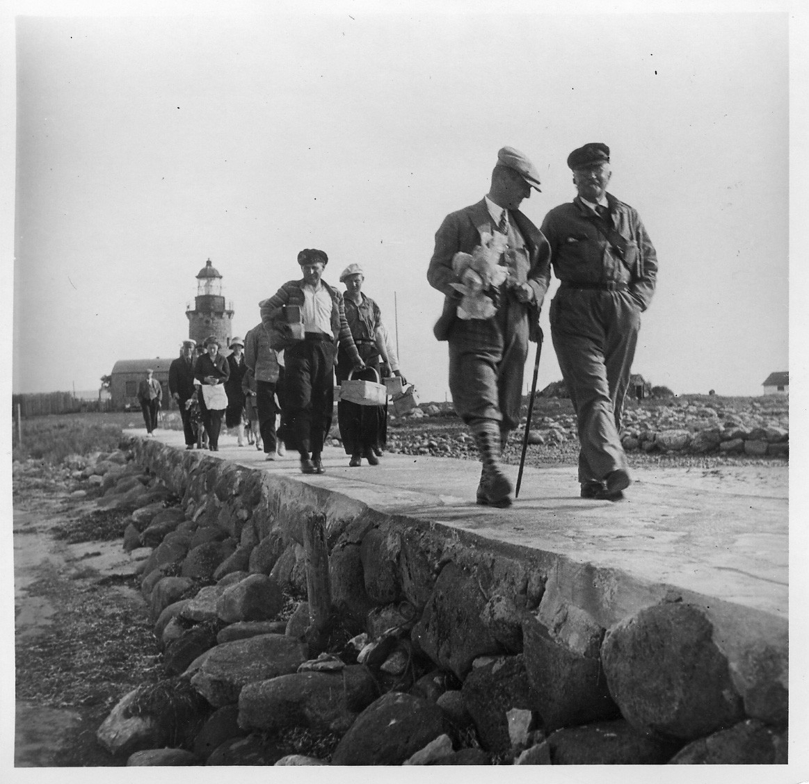 'Akka-expeditionen sommaren 1931: :: :: Drygt 10 personer, män och kvinnor, på vägen från Nordre Rönner fyr. Ser ut att bära matkorgar. Leonard Axel Jägerskiöld längst fram till höger. :: :: Ingår i serie med fotonr. 2182-2234.'