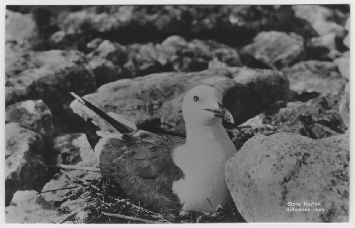 'Silltrut liggande på boet bland stenblock, sedd snett framifrån. ''Sillmåsen ruvar.'' Se fotonr. 2469, samma mootiv. :: :: Ingår i serie med fotonr. 2462-2487.'