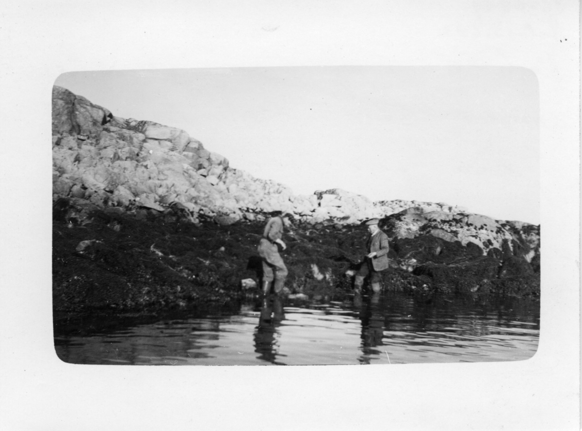 '2 män i strandkanten, iklädda stövlar. Männen är Nils Odhner och Carls Dons. Enligt bildtext: ''Vid flod är hela det mörka tångbältet under vatten''. :: :: Ingår i serie med fotonr. 3679-3693 se även 3694-3719.'