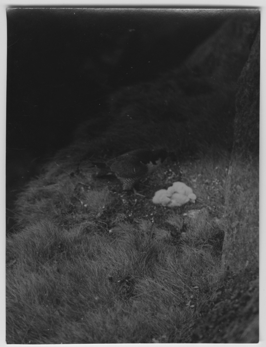 'Pilgrimsfalk med ca 2 st ungar, invid bergvägg. :: :: Text på baksidan av fotot ''Om första ...(omkr. 2.30 f.m.) - hona med en liten, plockad, huvudlös fågel i näbben, väcka med ett kort hostande skrik ungarna. De flesta fåglarna födas upp i detta tillstånd, det var därför ...svårt att på avstånd (5-6 m) identifiera de minsta. Korsnäbbar i stort antal samt gulsparvar m.fl. tages av den nästan ständigt jagande hanan. Honan höll sig till de större: kråkor (11 lågo i ...), en och annan småskrake, duva, gök o.s.v. Från soluppgången till kl 12 p.d. då jag avlägsnade mig, erhöllo ungarna icke mindre än 7 smärre fåglar.'' :: :: Se serie med fotonr. 3151-3200. Se även fotonr. 1771-1837.'
