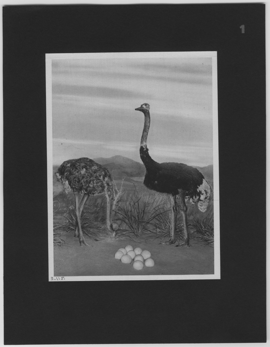 '2 st afrikanska strutsar vid bo med 10 st ägg. :: :: Bilderna är numrerade 1-6 och det finns ett tillhörande häfte med en text till varje bild: Afrikanska strutsar, Krokodiler, Gördeldjur, Sydamerikansk urskog, Apor från Sundaöarna samt Isbjörnar. :: :: Ingår i en serie fotonr. 3096-3108 med 12 st fotografier av dioramorna i Zoologiska museet i Berlin och fotonr. 3109-3120 med 12 st fotografier av dioramorna i Hermann-Roemer-museet, Hildesheim.'