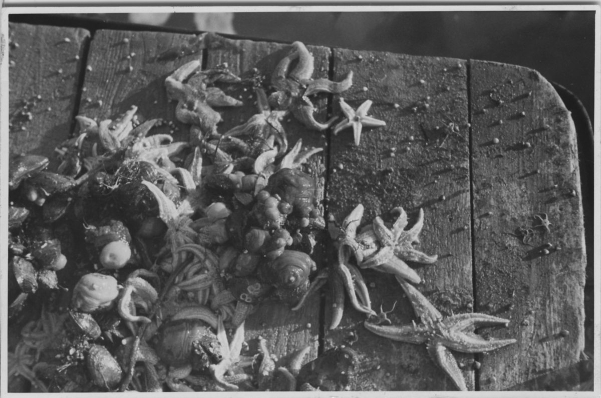 'Biologiska föreningens utfärd till Nordjylland: :: :: Ostronskrapningar i Limfjorden, närbild på hög med havsdjur, bl.a. sjöstjärnor. :: :: Ingår i serie med fotonr. 3824-3859.'