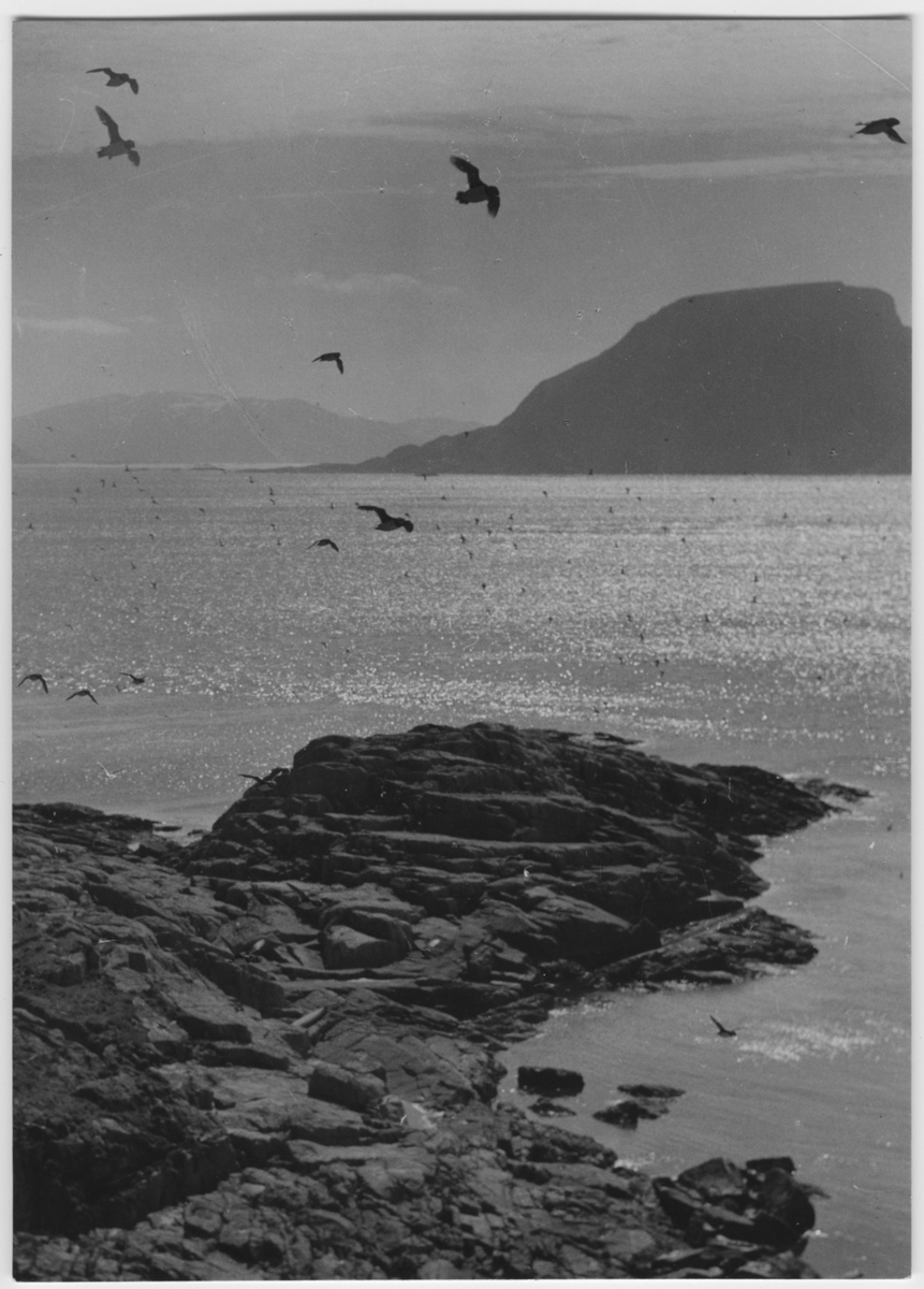'Vy med lunnefåglar, fåglar i luften, klippor och öar. :: :: Ingår i serie med fotonr. 3382-3407.'