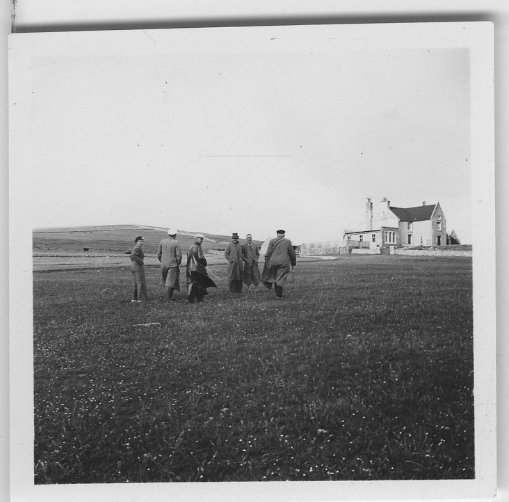 'Från ''Skageraks''-expeditionen till Hebriderna och Shetland: :: :: 6 personer (män) gåendes mot ett hus på en äng. Enligt anteckning på baksidan av fotografiet: ''På väg till té hos Sandisons''. :: :: Ingår i serie med fotonr. 4111:1-43.'