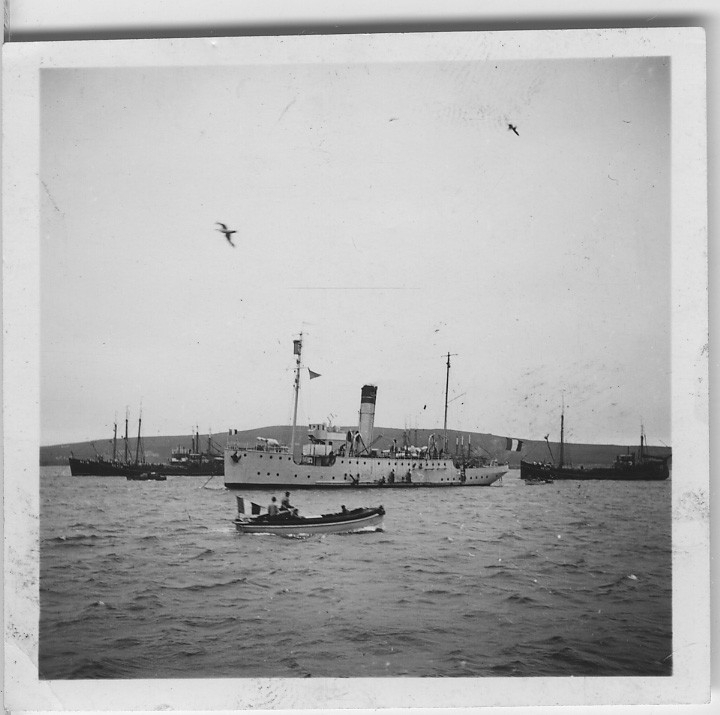 'Från ''Skageraks''-expeditionen till Hebriderna och Shetland: :: :: Ett antal större och mindre båtar till havs. Enligt anteckning på baksidan av fotografiet: ''Franskt bevakningsfartyg i Lerwick''. :: :: Ingår i serie med fotonr. 4111:1-43.'
