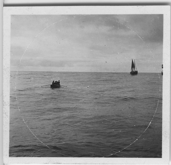 'Från ''Skageraks''-expeditionen till Hebriderna och Shetland: . :: :: En roddbåt med människor samt en segelbåt fotograferade från avstånd, enligt anteckning på baksida av fotografiet: ''Molander m. assistent på väg t. sv. [till svensk] fiskebåt.'' :: :: Ingår i serie med fotonr. 4111:1-43.'