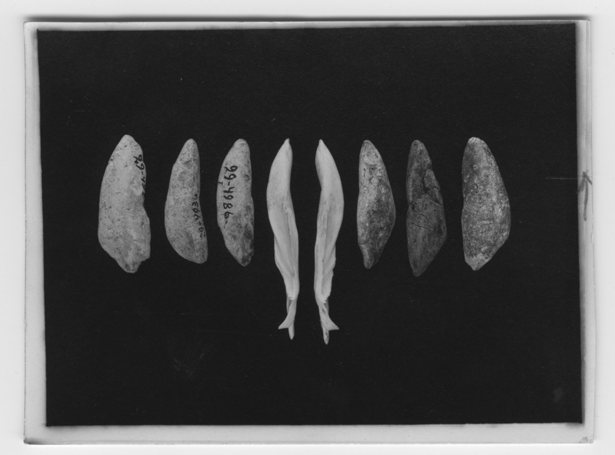 'Cleithra av kolja, recenta och subfossila, 8 st uppradade. :: Fynddatum: 1928-00-00-1929-00-00. :: :: Bildtext från årstryck: I mitten två skulderben, cleithra, av kolja, med de förtjockade framändarna upptill. Bredvid subfossila stycken, motsvarande dessa förtjockade partier, några av dem har tidigare tolkats som tänder av späckhuggare. :: :: Bilden med i Göteborgs Naturhistoriska Museums Årstryck 1941 s. 10.'