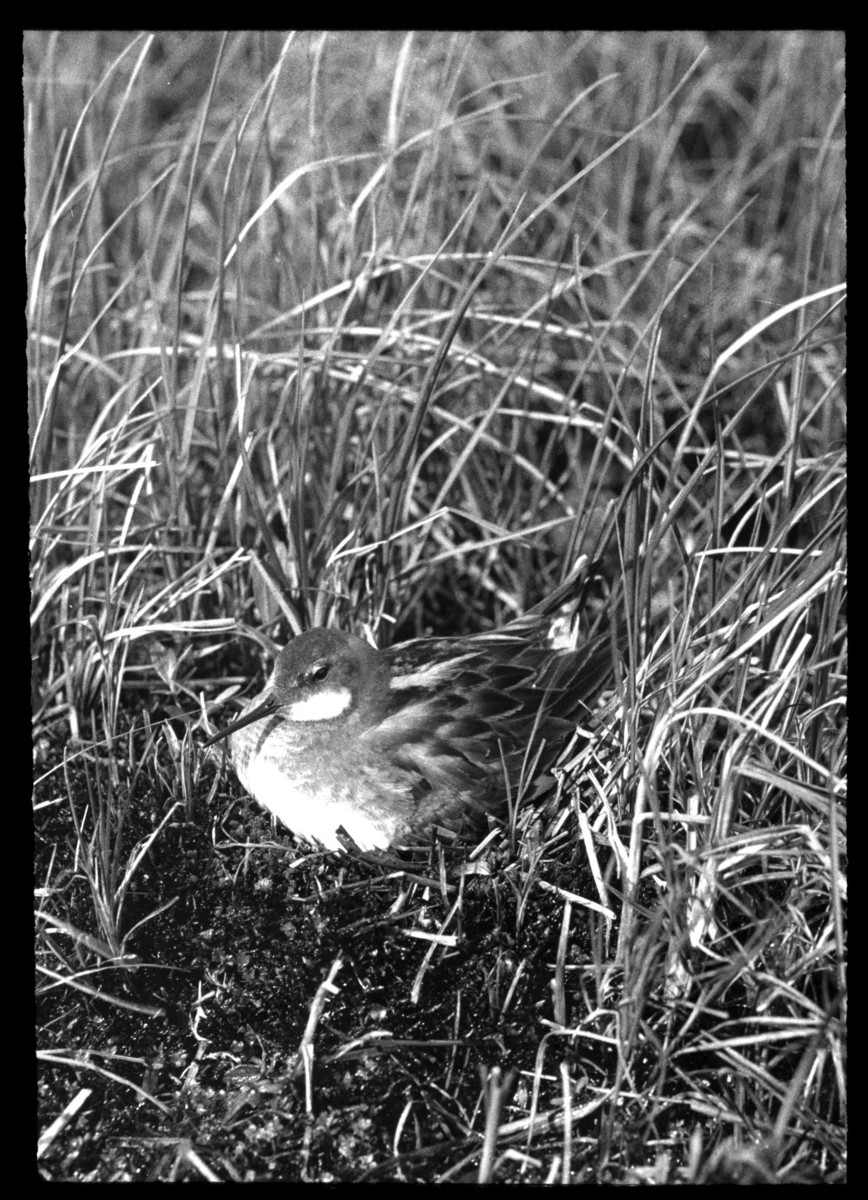 'Bildtext: ''Simsnäppa ruvar.'' Simsnäppa sedd snett från sidan, på boet i högt gräs. :: :: Ingår i serie med fotonr. 5173:1-7, numrerade ned bildnr 278-284. Se även hela serien med fotonr. 5155-5174.'