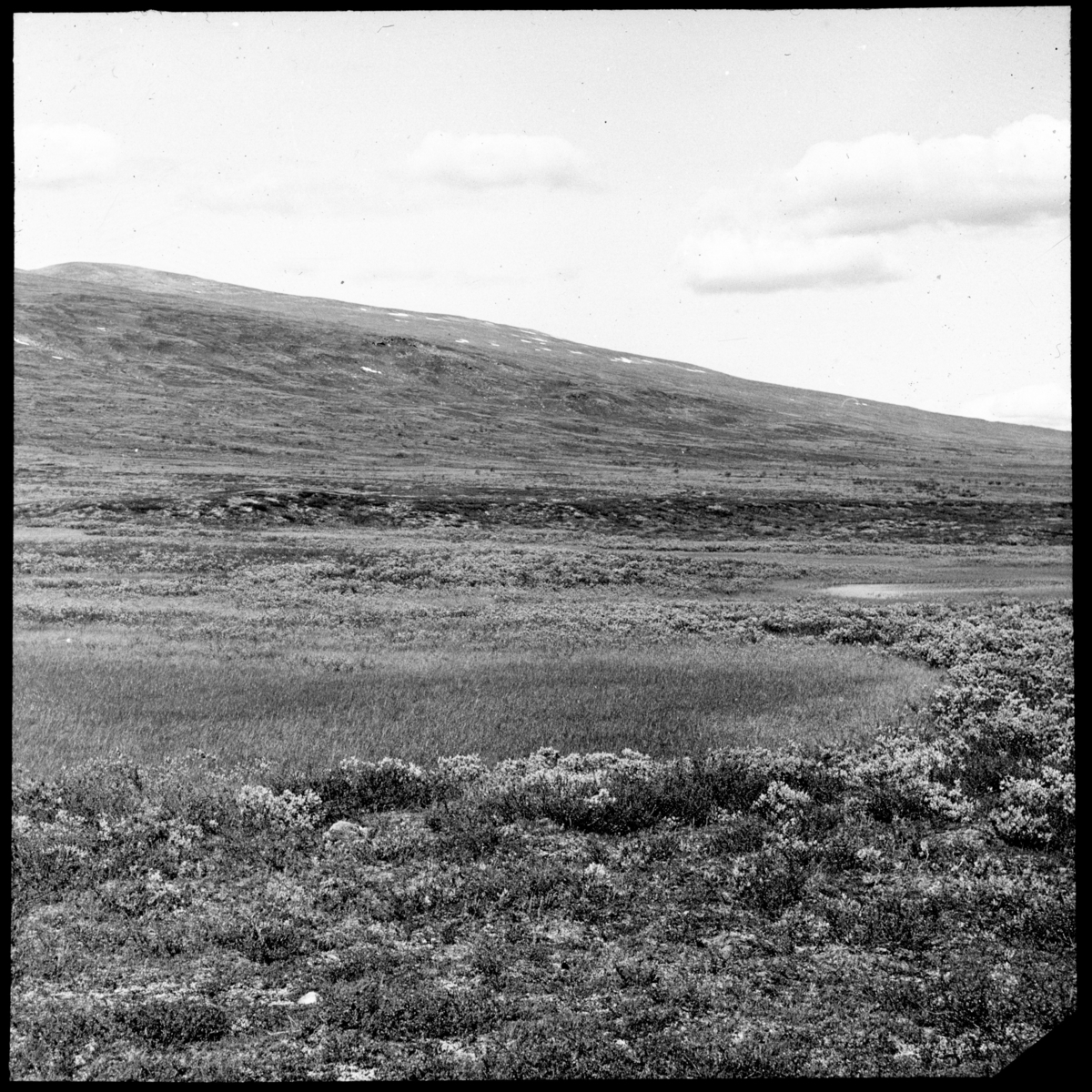 'Bildtext: ''Häckningsterräng för kärrsnäppa och myrsnäppa norr om Tjålmejaure.'' Vy med våtmark, kärr och gräs- och risvegetation nedanför sluttning. :: :: Ingår i serie med fotonr. 5163:1-7 numrerade med bildnr 201-207.'