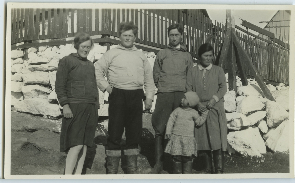'Utanför Jensens och Nielsens hus, sett från havet. 1 kvinna och 1 man nedanför husgrunden, tillsammans med 3 inuiter (eskimåer), 1 man, 1 kvinna och 1 barn. Kläder. Klädsel. :: :: Enligt kuvertet som negativet låg i ''Trip to W-Greenland''. :: :: Ingår i serie Fotonr. 5217:1-103. Se även hela fotonr. 5202-5218 med bilder från Frits Johansen.'