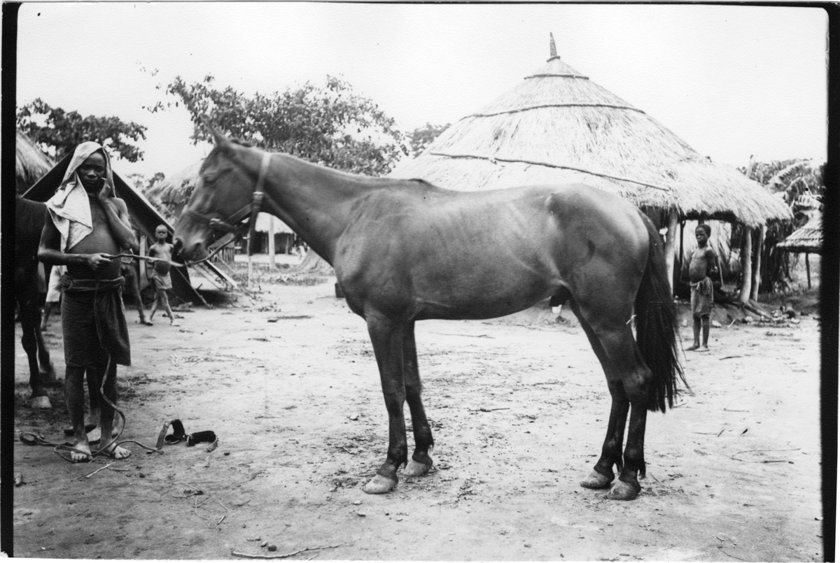 'Diverse fotografier från bl.a. dåvarande Nordrhodesia, nu Zambia, tagna av Konsul Magnus Leijer. :: :: En pojke håller i en häst som är fotograferad från sidan. I bakgrunden är ytterligare tre pojkar synliga framför ett tält och en hydda.'