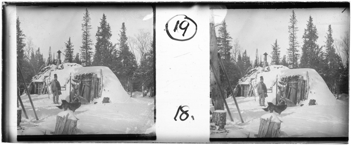 'Bildtext: ''Lappkåta, exteriör (P. Möller fot.'' :: Vy med 1 lappkåta, 1 man och 1 kvinna utanför tillsammans med hundar. Glasfönster och skorsten. :: :: Ingår i serie med fotonr. 5254, se även hela serien med fotonr. 5237-5267.'