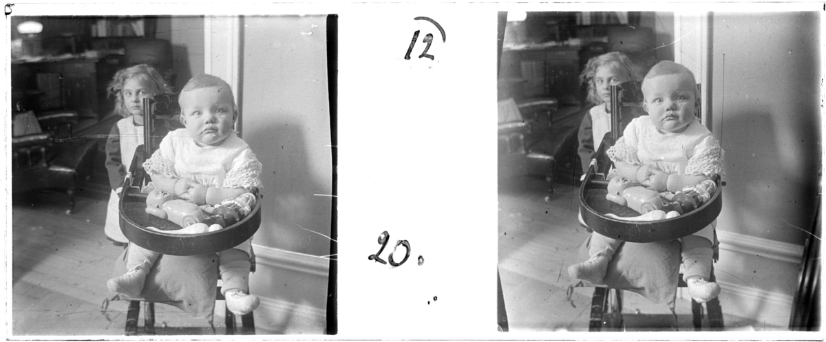 'Bildtext: ''Magnhild och Britta Charleston.'' :: Närbild på litet barn, bebis, sittande i barnstol, bakom står 1 flicka. Kläder. Docka. Leksaker. I bakgrunden fåtölj, bordslampa och ev. bokhylla med böcker. Möbler. :: :: Ingår i serie med fotonr. 5256:1-18, se även hela serien med fotonr. 5237-5267.'