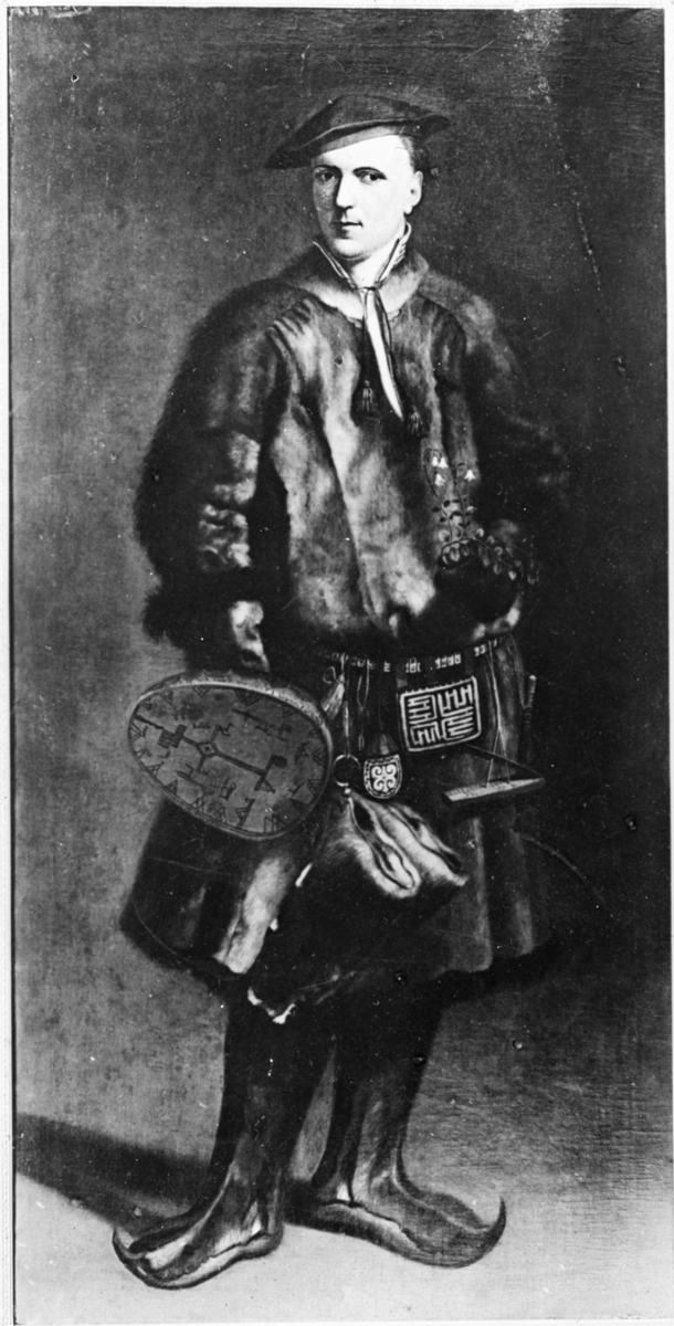 'Porträtt av 1 man i näbbstövlar och med liten trumma, s.k. trolltrumma. Troligtvis en nåjd. :: :: Ingår i fotonr. 5305:1-50 med Leonard Axel Jägerskiölds föredragsbilder om ''Linnés resor och berömda män'' (Arkivnr.1).'
