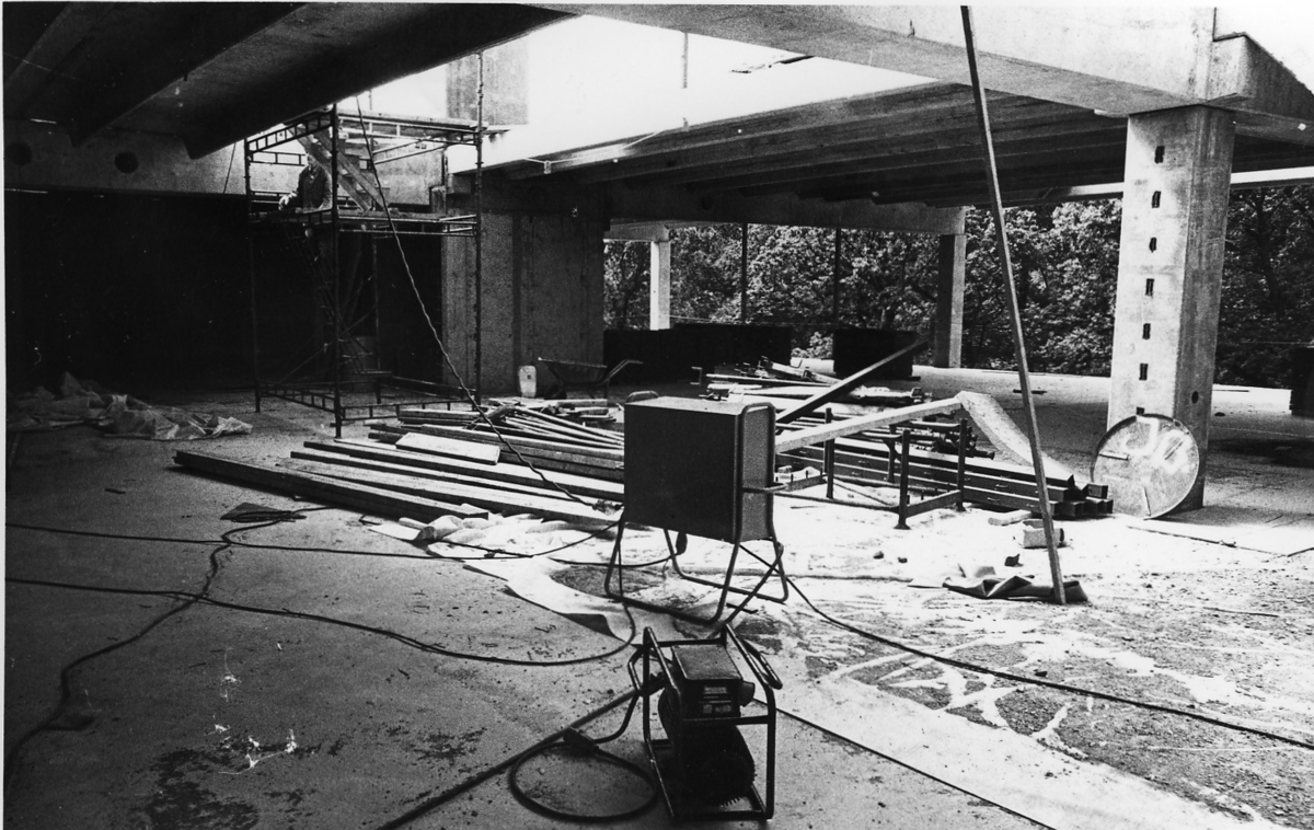 'Tillbyggnaden av Göteborgs Naturhistoriska Museum juni 1979. Byggarbetsplatsen sydöstra delen av våningsplan 3 i tillbyggnaden. En byggnadsarbetare. :: :: Ingår i serie med fotonr. 5527:69-216.'