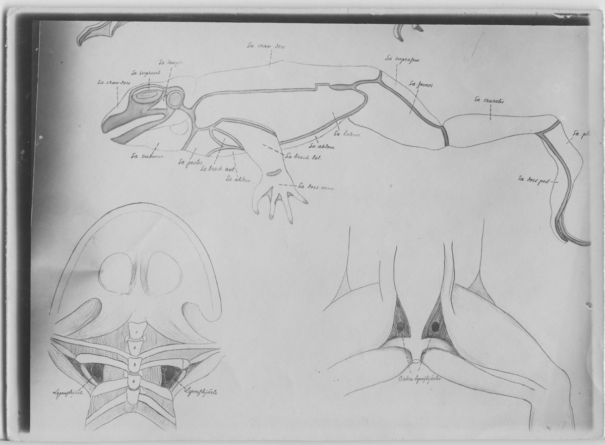 'Teckning av lymfsystem hos groda med detaljillustration av lymfhjärtan. Groda iluustrerad från sidan. Latinska namnen på organens delar är utsatta. Bilden hör samman med fotonr.5654:29 :: :: ''Fotografier använda vid dissektionskursen våren 1928'' . :: Avfotograferade teckningar på skelett och organ. :: På baksidan av vissa står det Kerstin Nyblén :: V.T.-18 :: , ur bok'