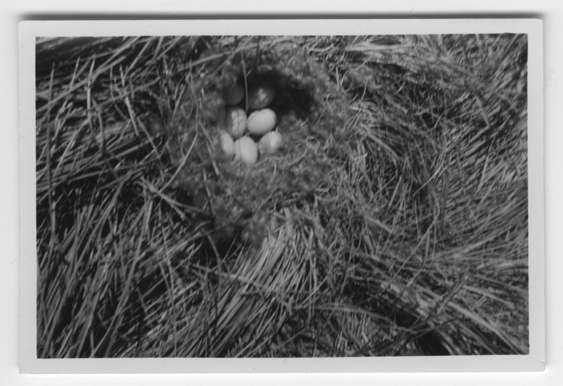 'Text enligt foto: ''Bo med 8 st nästan fullruvade ägg av gräsanden på en tuva i Möckelmossen i skrattmåskolonin, som bestod av ungefär 300 par. Fotot taget på 1 meters avstånd.'' :: :: Ingår i serie med fotonr. 4500:1-172.'