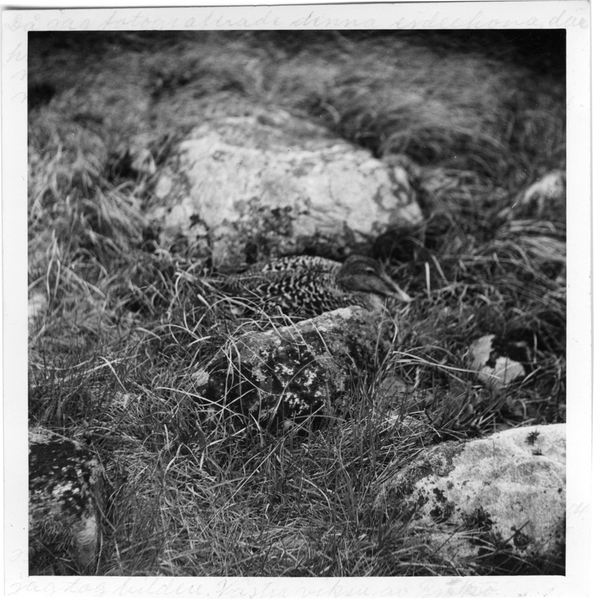 'Enligt anteckning på fotografiets baksida: :: ''Då jag fotograferade denna ejderhona där hon tryggt ruvade sina ägg mellan en mindre och en större sten, talade jag med henne och sade, att jag skulle ta en bild av henne. :: Hon ser så vackert in i kameran, då jag tog bilden.'' :: :: Ingår i en serie med fotonr. 4512:1-57 med diverse foton av fågelbon med ägg och ungar. Varje fotografi har utförliga anteckningar på sin baksida, kopierade från framsidan, spår av de på framsidan är fortfarande synliga.'