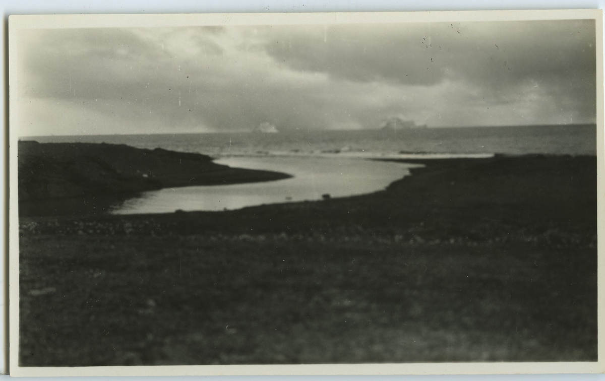 'Vy över havet och isblock på avstånd, Godhamn. :: :: Ingår i serie Fotonr. 5217:1-103. Se även hela fotonr. 5202-5218 med bilder från Frits Johansen.'