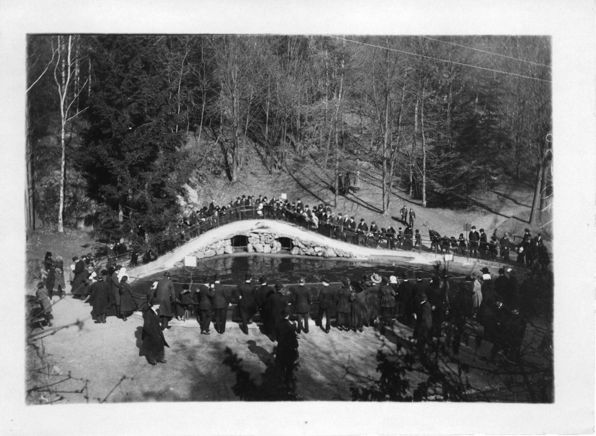 Folksamling runt säldammen. Vy över dammen med människor stående runt hela.