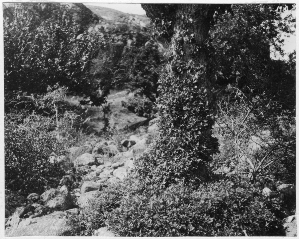 'Bildtext: ''Ek med av kreatur avbetade vattenskott på stam och ovanjordiska rotdelar.'' Närbild på ekstam och omgivande blockrika mark. :: :: Fotonr. 7046:293-306 indelade som ''Skogsmarken. Trädens byggnad och livsföreteelser.''. Ingår i serie med fotonr. 7046:1-383, 7047:1-33 och 7048:1-67 med bilder från Länsjägmästare John Lindners bildarkiv.'