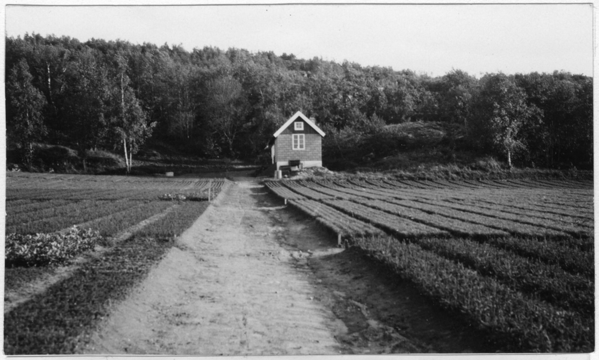 'Bildtext: ''Skogsvårdsstyrelsens plantskola.'' Vy med odling av trädplantor och litet tegelhus. :: :: Fotonr. 7046:307-328 indelade som ''Skogsodling och självsådd.'' Ingår i serie med fotonr. 7046:1-383, 7047:1-33 och 7048:1-67 med bilder från Länsjägmästare John Lindners bildarkiv.'