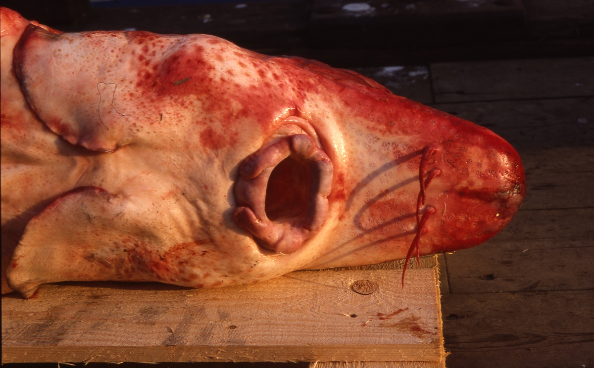 'Stör fångad i Nordsjön: :: :: Närbild på huvud, sett underifrån, gällock, skäggtömmar och mun. :: :: Ingår i serie med fotonr. 6029:1-12. Se även fotonr. 6028.'