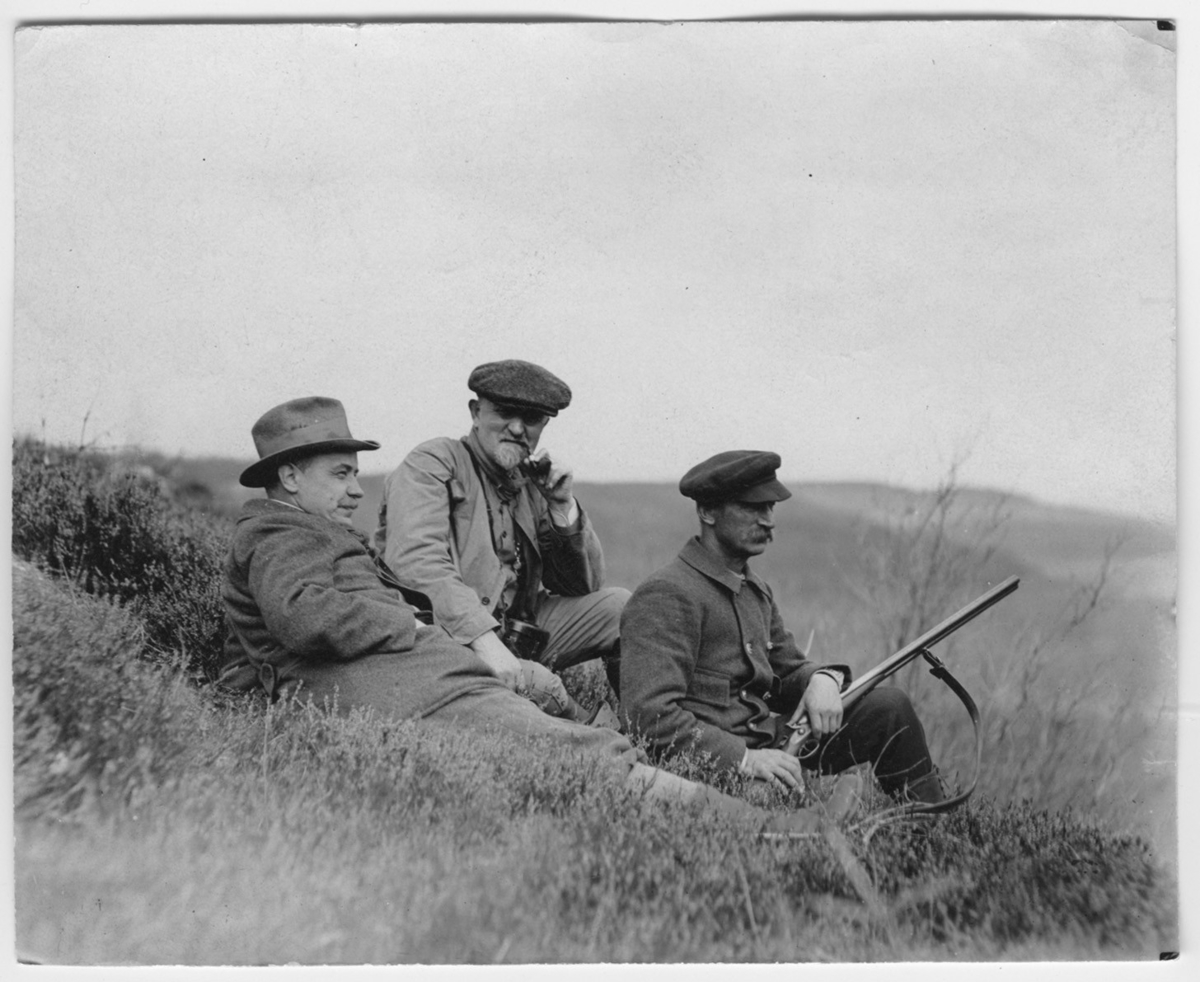 'Orrspel. Sörberget, där leken pågick. 3 män sittandes på ljungbevuxen mark, däribland Dr R. Söderberg och Leonard Axel Jägerskiöld (i mitten). Iklädda gevär, kikare och keps. :: :: Se även fotonr. 687-691.'