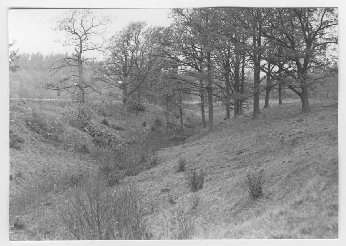 'Bildtext: ''Meandrande bäck. Riktning 277.'' :: Vy med del av bäcken med lövträd (ek) växande i slänten ned mot bäcken. :: :: Ingår i serie med fotonr. 6970:1-1125, dokumentation av Hisingens naturgeografi, visande landskapsformerna i stora drag och gjord inför exploateringen av området. Platserna för fotograferingen finns utsatta på karta i skala 1:4000 som finns på Göteborgs Naturhistoriska musem. Fotoriktningen mättes med kompass i gammalgrader.'