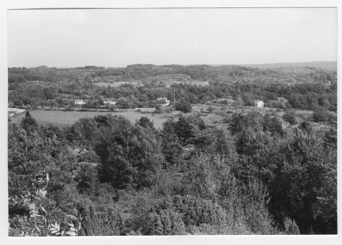 'Bildtext: ''Berglandskap med sedimentslätt. Riktning 52.'' :: I förgrunden berghäll bevuxen med enbuskar, lövträd och barrträd. Vy ner över öppna fält, åkrar och intilliggande hus. :: :: Ingår i serie med fotonr. 6970:1-1125, dokumentation av Hisingens naturgeografi, visande landskapsformerna i stora drag och gjord inför exploateringen av området. Platserna för fotograferingen finns utsatta på karta i skala 1:4000 som finns på Göteborgs Naturhistoriska musem. Fotoriktningen mättes med kompass i gammalgrader.'