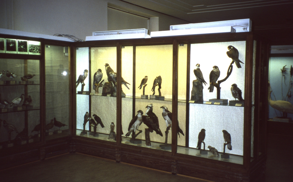 'Montrarna i fågelgången fotograferade före restaurering. :: Svenska fåglar. Rovfåglar. :: :: Ingår i serie med fotonr. 6939:1-54.'