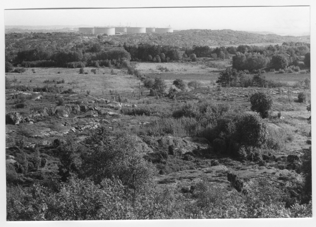 'Bildtext: ''Sedimentyta i hällområde. Riktning 170.'' :: Vy över öppna fält, åkermark. I finden oljeraffinaderier, silos. :: :: Ingår i serie med fotonr. 6970:1-1125, dokumentation av Hisingens naturgeografi, visande landskapsformerna i stora drag och gjord inför exploateringen av området. Platserna för fotograferingen finns utsatta på karta i skala 1:4000 som finns på Göteborgs Naturhistoriska musem. Fotoriktningen mättes med kompass i gammalgrader.'