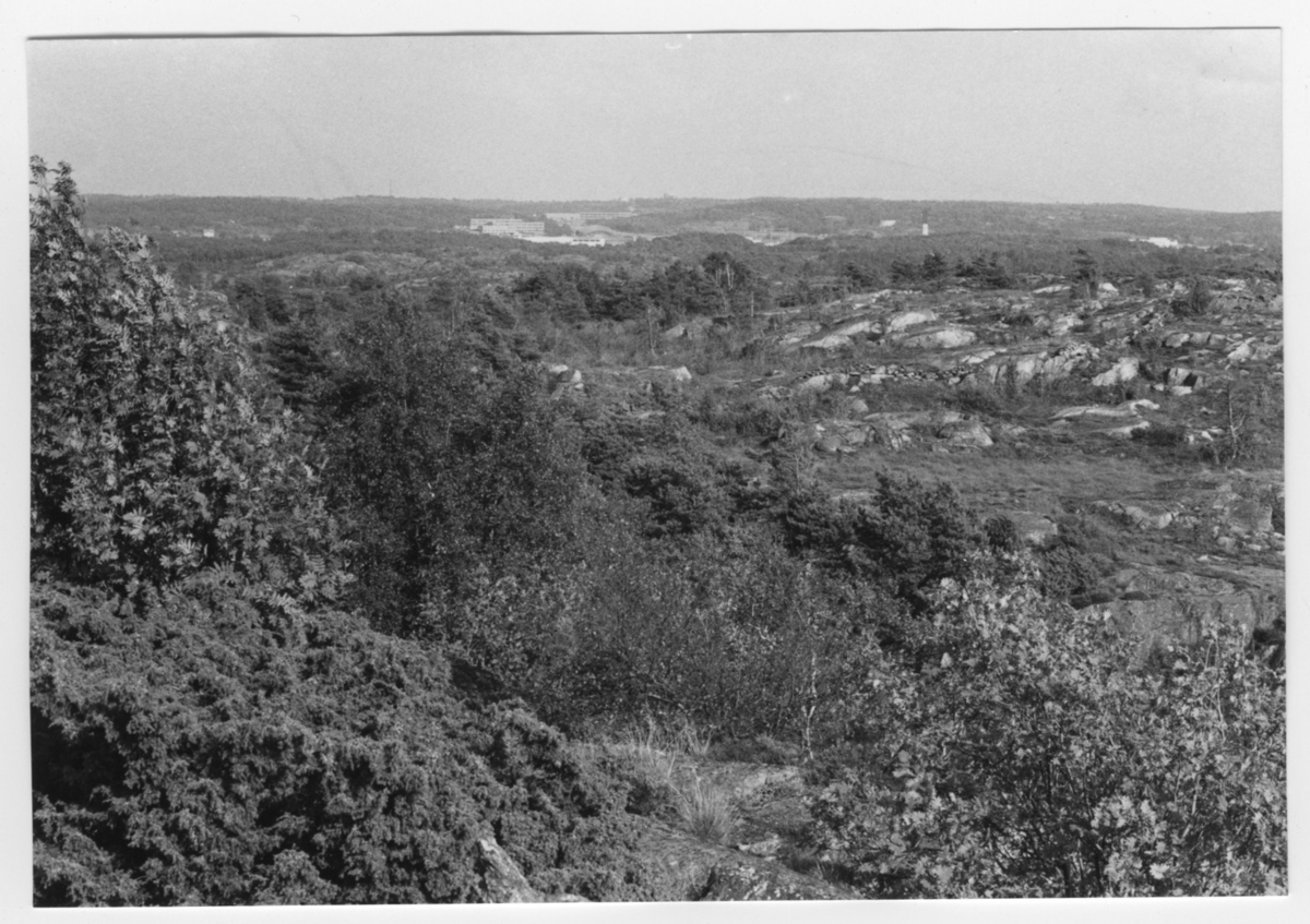 'Bildtext: ''Hällar. Riktning 90.'' :: Vy över berghällar med viss träd och buskvegetation. I fonden byggnader. :: :: Ingår i serie med fotonr. 6970:1-1125, dokumentation av Hisingens naturgeografi, visande landskapsformerna i stora drag och gjord inför exploateringen av området. Platserna för fotograferingen finns utsatta på karta i skala 1:4000 som finns på Göteborgs Naturhistoriska musem. Fotoriktningen mättes med kompass i gammalgrader.'