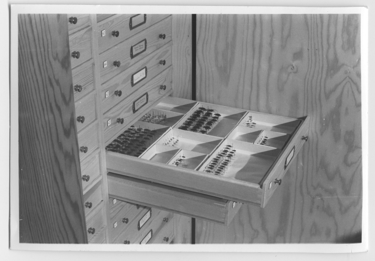 'Mollusksamlingen på Göteborgs Naturhistoriska museum: :: :: Låda med insekter utdragen ur skåp. :: :: Se även fotonr. 6965:6-7, 12-13 och 15. Ingår i serie med fotonr. 6965:1-25.'