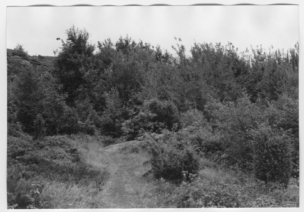 'Bildtext: ''Lövskogsdunge i spricka. Riktning 164.'' Närbild på lövträdsbestånd med en och hög gräsvegetation i förgrunden. :: :: Ingår i serie med fotonr. 6970:1-1125, dokumentation av Hisingens naturgeografi, visande landskapsformerna i stora drag och gjord inför exploateringen av området. Platserna för fotograferingen finns utsatta på karta i skala 1:4000 som finns på Göteborgs Naturhistoriska musem. Fotoriktningen mättes med kompass i gammalgrader.'
