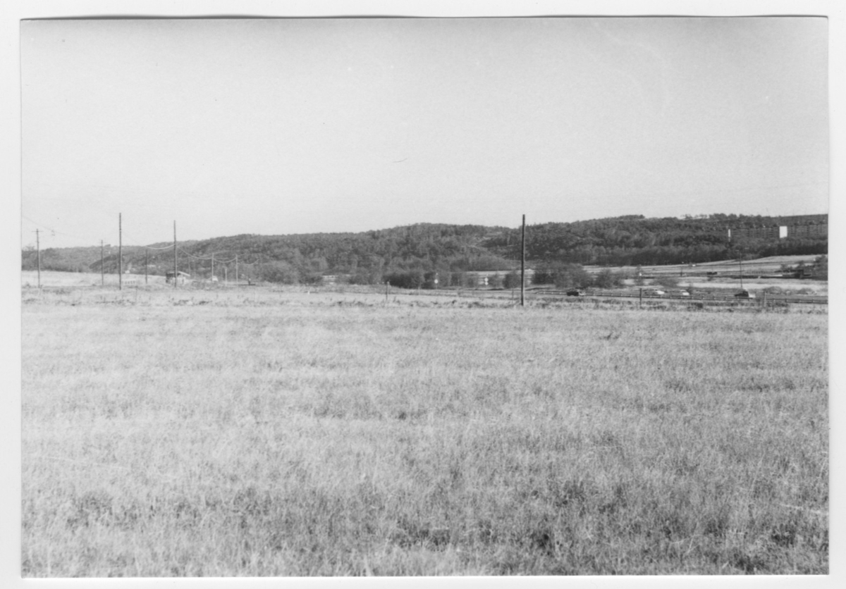 'Bildtext: ''Götaälvdalgången. Riktning 33.'' :: Vy med öppet fält, åkermark i förgrunden, väg med bilar och i fonden skogspartier. :: :: Ingår i serie med fotonr. 6970:1-1125, dokumentation av Hisingens naturgeografi, visande landskapsformerna i stora drag och gjord inför exploateringen av området. Platserna för fotograferingen finns utsatta på karta i skala 1:4000 som finns på Göteborgs Naturhistoriska musem. Fotoriktningen mättes med kompass i gammalgrader.'