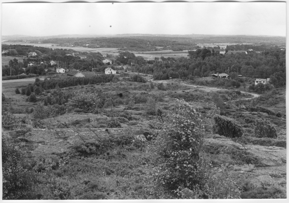 'Bildtext: ''Hällparti. Riktning 140.'' I förgrunden berghäll med enbuskar. Vy ner mot väg och hus. I fonden öppna fält. :: :: Ingår i serie med fotonr. 6970:1-1125, dokumentation av Hisingens naturgeografi, visande landskapsformerna i stora drag och gjord inför exploateringen av området. Platserna för fotograferingen finns utsatta på karta i skala 1:4000 som finns på Göteborgs Naturhistoriska musem. Fotoriktningen mättes med kompass i gammalgrader.'