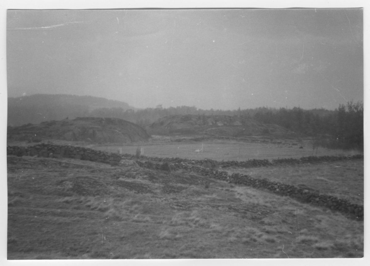 'Bildtext: ''Sedimentficka i hällandskap. Riktning 0.'' :: :: Ingår i serie med fotonr. 6970:1-1125, dokumentation av Hisingens naturgeografi, visande landskapsformerna i stora drag och gjord inför exploateringen av området. Platserna för fotograferingen finns utsatta på karta i skala 1:4000 som finns på Göteborgs Naturhistoriska musem. Fotoriktningen mättes med kompass i gammalgrader.'