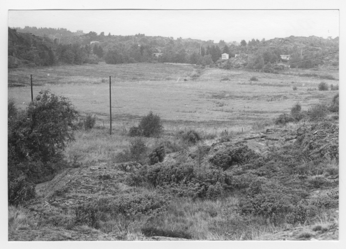 'Bildtext: ''Sedimentdalgång. Riktning 356.'' :: I förgrunden bergäll med enbuskar, vy ner överdalgången med öppna fält, åkermark. På avstånd hus. :: :: Ingår i serie med fotonr. 6970:1-1125, dokumentation av Hisingens naturgeografi, visande landskapsformerna i stora drag och gjord inför exploateringen av området. Platserna för fotograferingen finns utsatta på karta i skala 1:4000 som finns på Göteborgs Naturhistoriska musem. Fotoriktningen mättes med kompass i gammalgrader.'