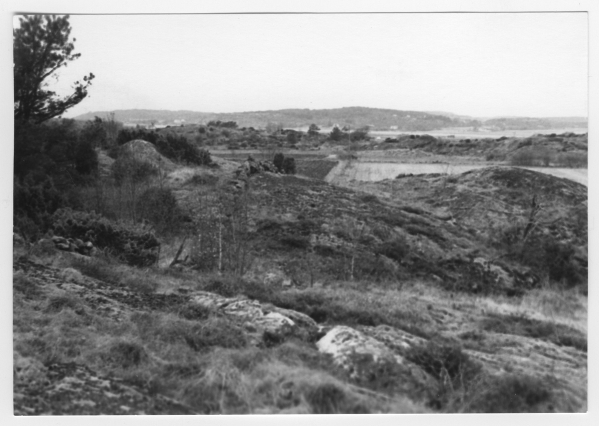 'Bildtext: ''Hällpartier. Riktning 260.'' Vy med landskap bestående av delvis bevuxna berghällar med öppna fält emellan. :: :: Ingår i serie med fotonr. 6970:1-1125, dokumentation av Hisingens naturgeografi, visande landskapsformerna i stora drag och gjord inför exploateringen av området. Platserna för fotograferingen finns utsatta på karta i skala 1:4000 som finns på Göteborgs Naturhistoriska musem. Fotoriktningen mättes med kompass i gammalgrader.'