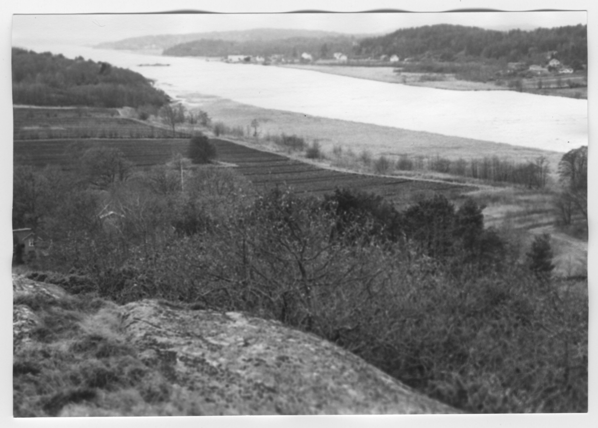 'Bildtext: ''Nordre älv med strandsediment. Riktning 250.'' Vy tagen uppifrån berg ner över öppna fält, åkrar och Nordre älvs vatten. På andra sidan hus. :: :: Ingår i serie med fotonr. 6970:1-1125, dokumentation av Hisingens naturgeografi, visande landskapsformerna i stora drag och gjord inför exploateringen av området. Platserna för fotograferingen finns utsatta på karta i skala 1:4000 som finns på Göteborgs Naturhistoriska musem. Fotoriktningen mättes med kompass i gammalgrader.'