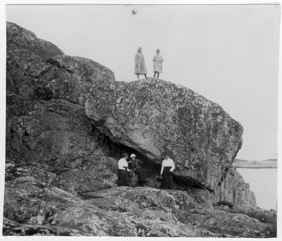 'Bildtext: ''Jätteblock.'' 2 kvinnor stående på 1 jättesteblock och 3 personer, varav minst 2 kvinnor, stående nedanför blocket. Vy med vatten intill berg. :: :: Fotonr. 7046:85-118 indelade som ''Geologiska bilder från Göteborgs- och Bohus län.'' Ingår i serie med fotonr. 7046:1-383, 7047:1-33 och 7048:1-67 med bilder från Länsjägmästare John Lindners bildarkiv.'