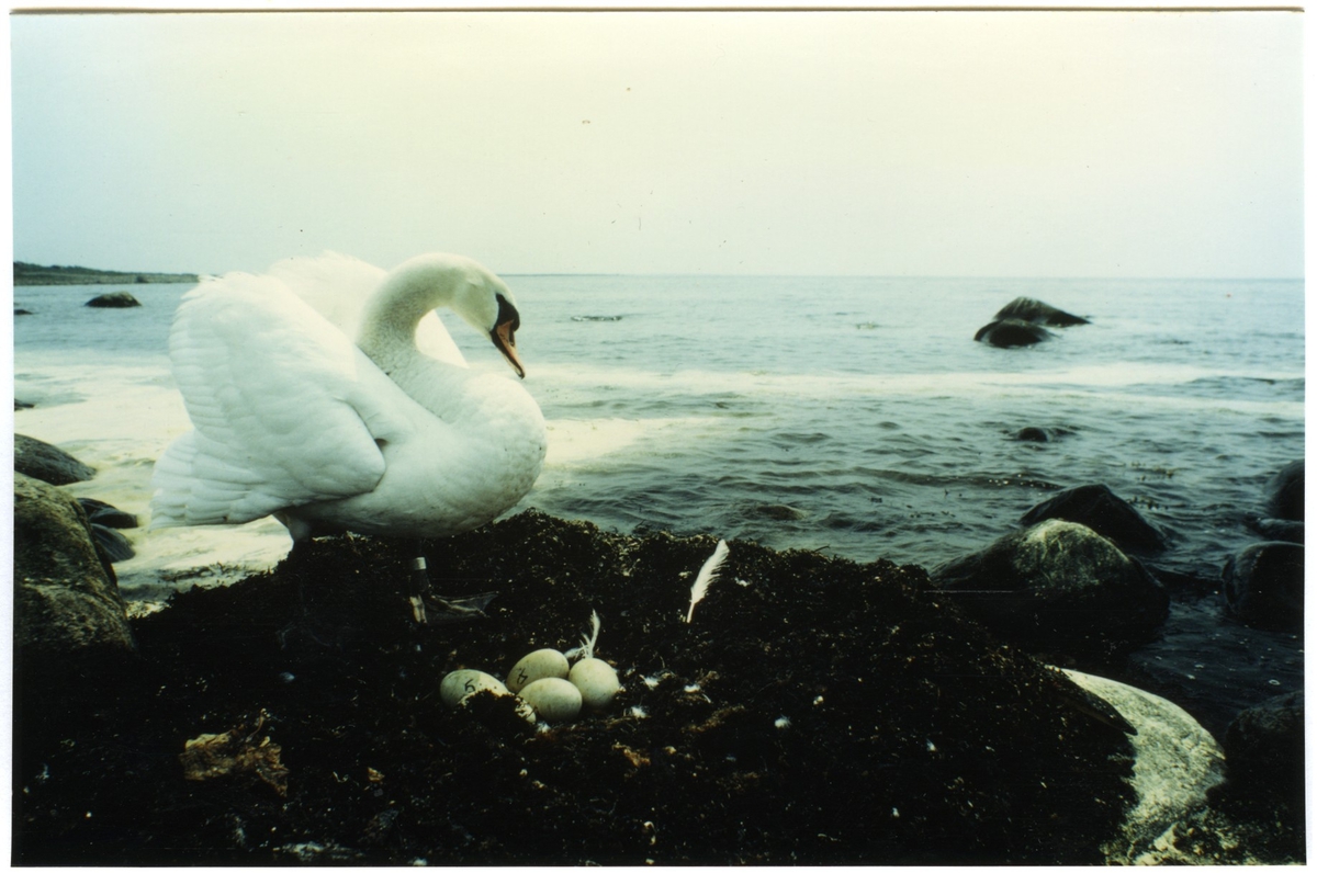 'Bildtext: ''Svanen kliver snart upp på boet igen.'' :: :: Ingår i serie med fotonr. 7102 med bilder tillhörande Svante Lysén, bilderna har lånats och digitaliserats och sedan återlämnats.'
