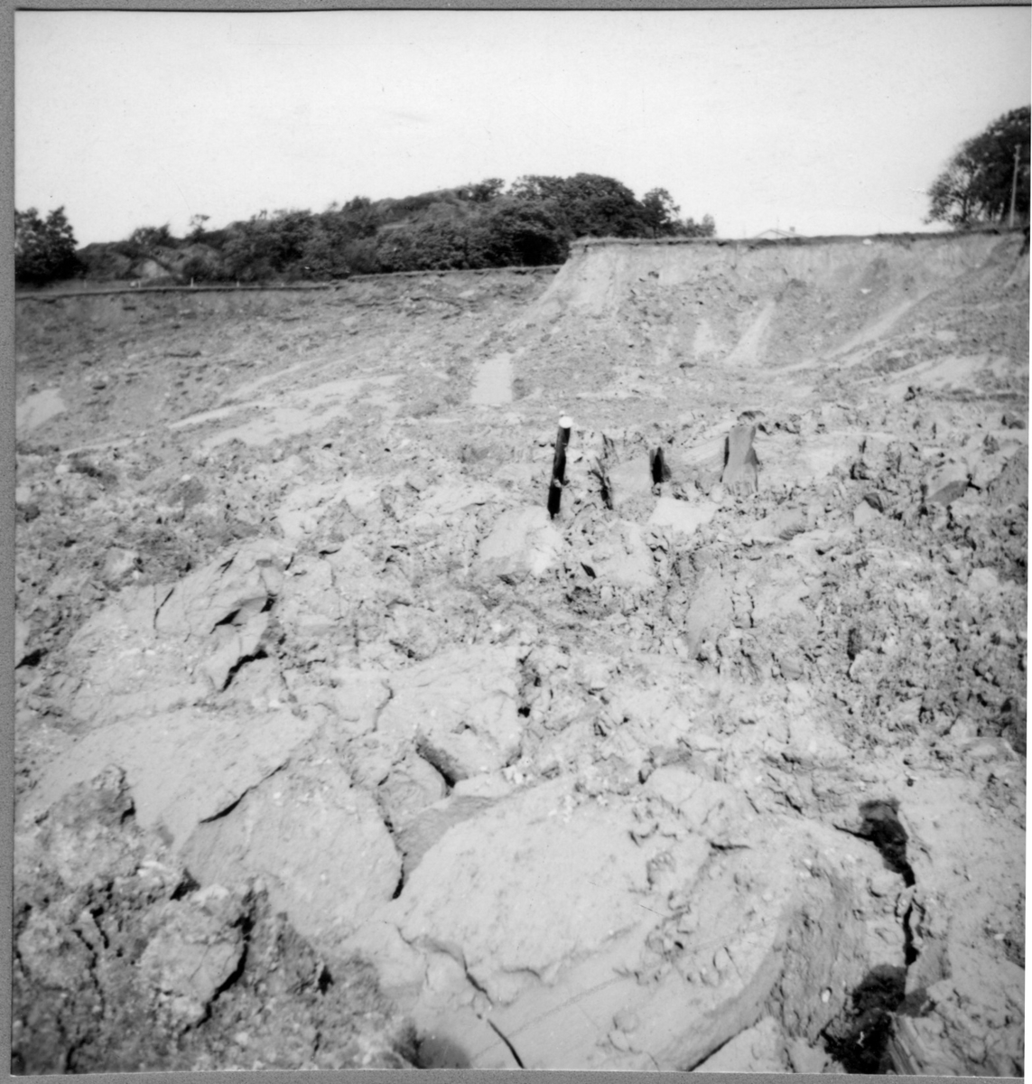 'Bildtext: ''Övre delen av skredområdet. Leran blottad. Obs! Telefonstolpen.'' Vy med lermassa som glidit, uppstickande telefonstolpe. :: :: Ingår i serie med fotonr. 7052:1-19 med bilder bl.a. från Surteskredet.'