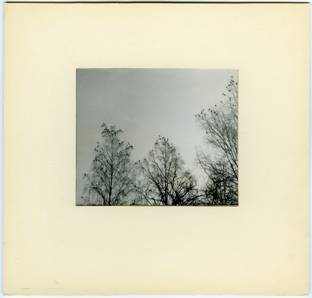 'Bildtext: ''Ca 200 sidensvansar i några björkar utanför vår gård.'' :: Trädtoppar (björk) med flock sidensvansar. :: :: Ingår i serie med fotonr. 7083:1-55.'