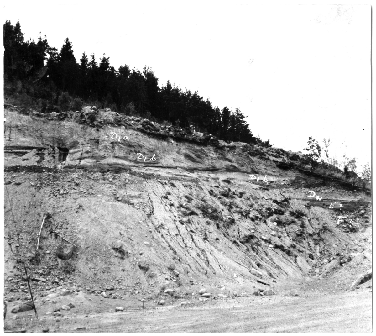 'Bildtext: ''Landsvägsväggen.'' Vy över en vägg i grustaget, med grusavlagringens lagerföljd, morän. Barrträdsvegetation ovanför grustaget. Lagren markerade på bilden. :: :: Ingår i serie med fotonr. 7060:1-20 med bilder från Dösebacka- och/eller Ellesbomoränen.'